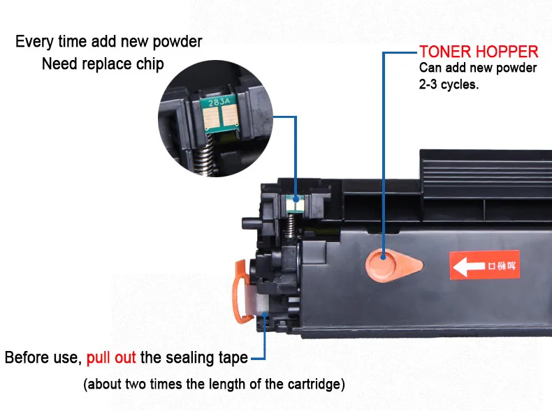 This CF283A toner cartridge has chip, so everytime after adding new powder, please