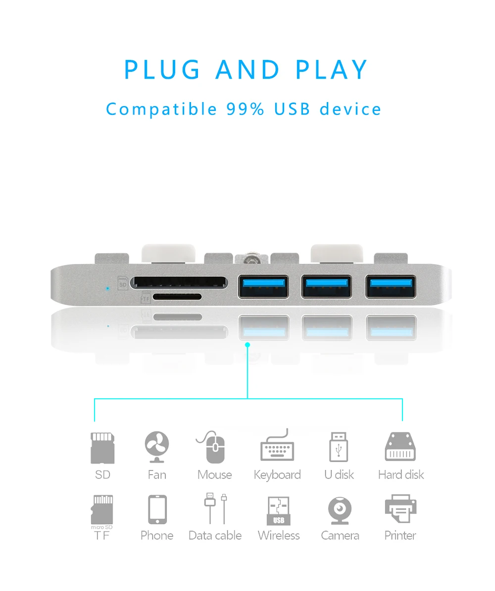 Rocketek ultra-thin premium aluminum 3-Port USB 3.0 hub with SD/TF card reader combo is exclusively designed for iMac. It adds three USB 3.0 ports and SD/TF card reader slots to the front side of your iMac. There is no more need to twist cables to get to the ports vertically. Now you can easily access USB ports and additional 2 slots card reader at an ergonomic angle! Its sleek aluminum design the perfect complement to your iMac computer. It does not require any software or complicated installation process. With a slim design, it saves you precious desktop space.