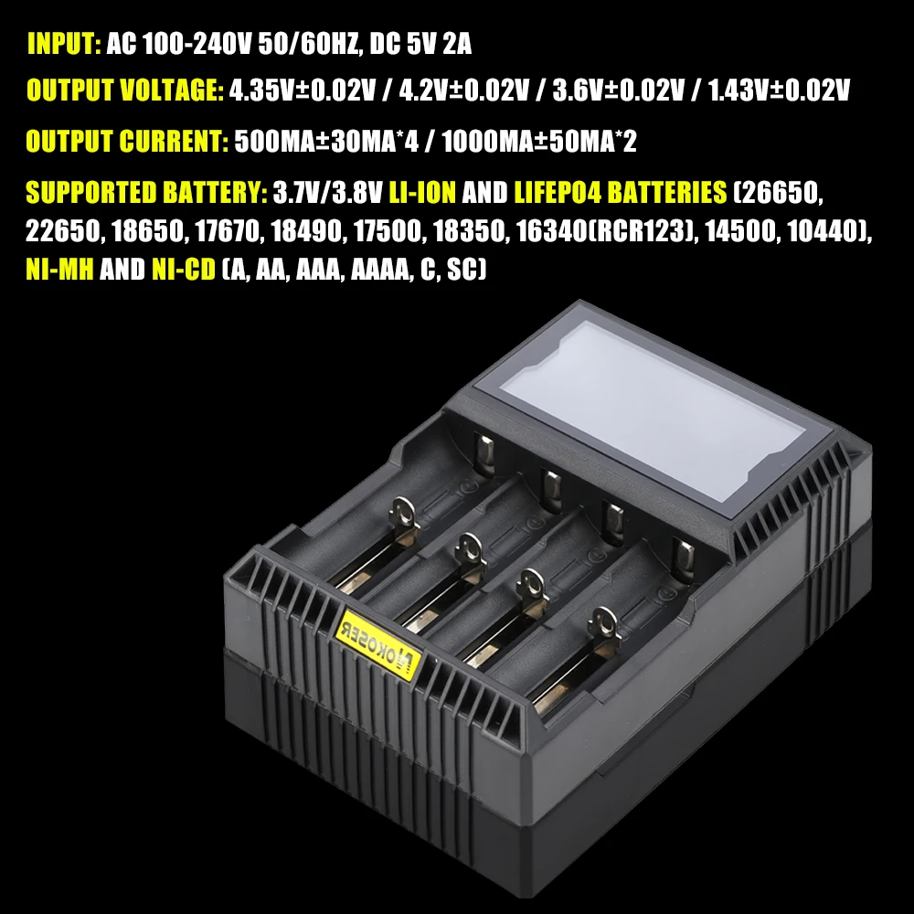 Supported battery: 3.7V/3.8V Li-ion and LiFePO4 batteries (26650, 22650, 18650, 17670, 18490, 17500, 18350, 16340(RCR123), 14500, 10440), Ni-MH and Ni-Cd (A, AA, AAA, AAAA, C, SC)