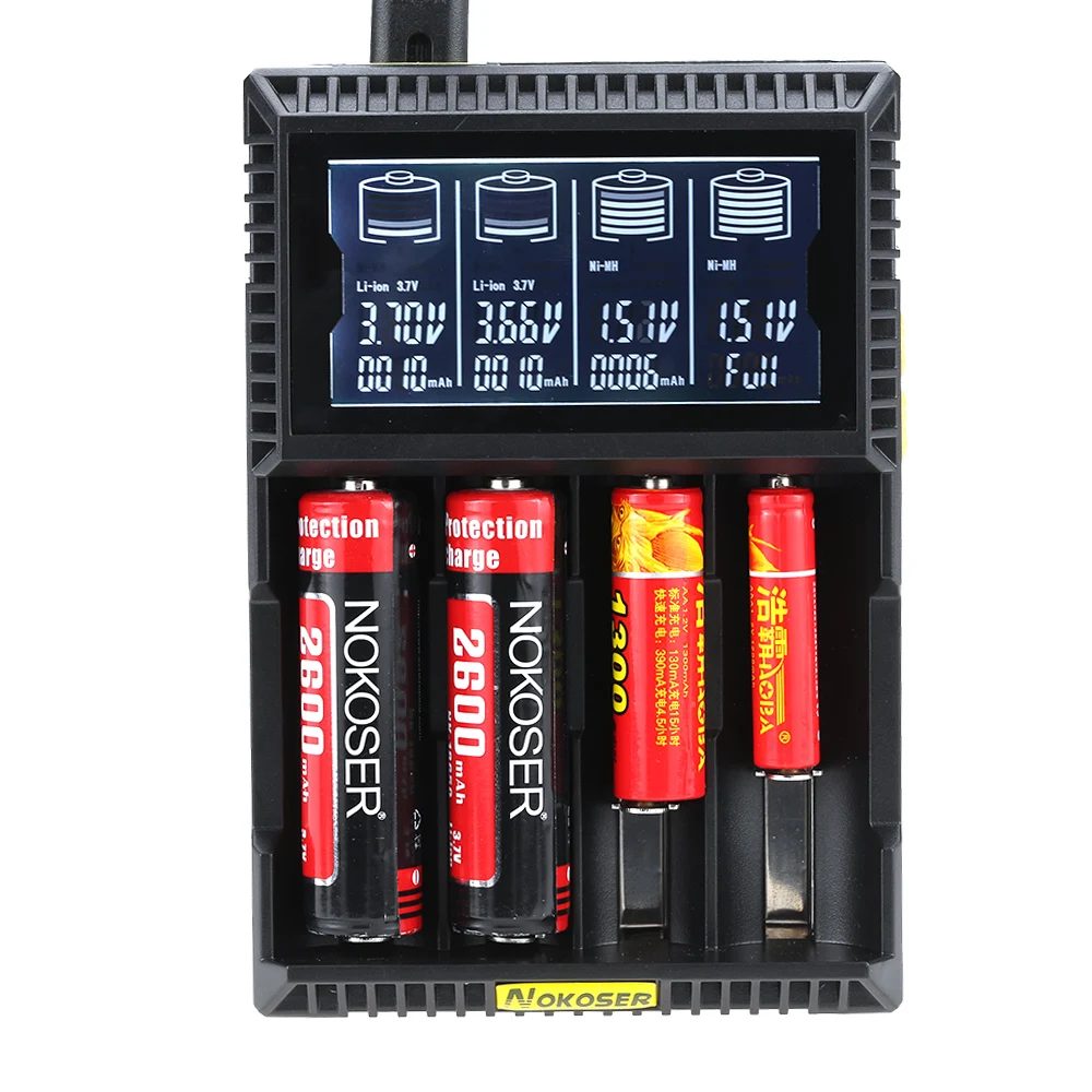 It is a universal smart charger compatible with almost all cylindrical rechargeable batteries, thus eliminating the need to own several chargers. It is compatible with not only Ni-MH, Ni-Cd, 3.7V/3.8V Li-ion batteries but also LiFePO4 batteries, in which it automatically detects Li-ion, Ni-MH and Ni-Cd batteries, and through manual selection is also capable of charging 3.8V Li-ion batteries and LiFePO4 batteries. Intelligent charging circuitry selects the optimal charging mode for a battery and each of the D4\'s four microcomputer-controlled charging slots then monitors and charges the battery independently. Furthermore, an integrated digital LCD screen clearly displays charging progress. And it supports automatic power-off function when charging is complete.