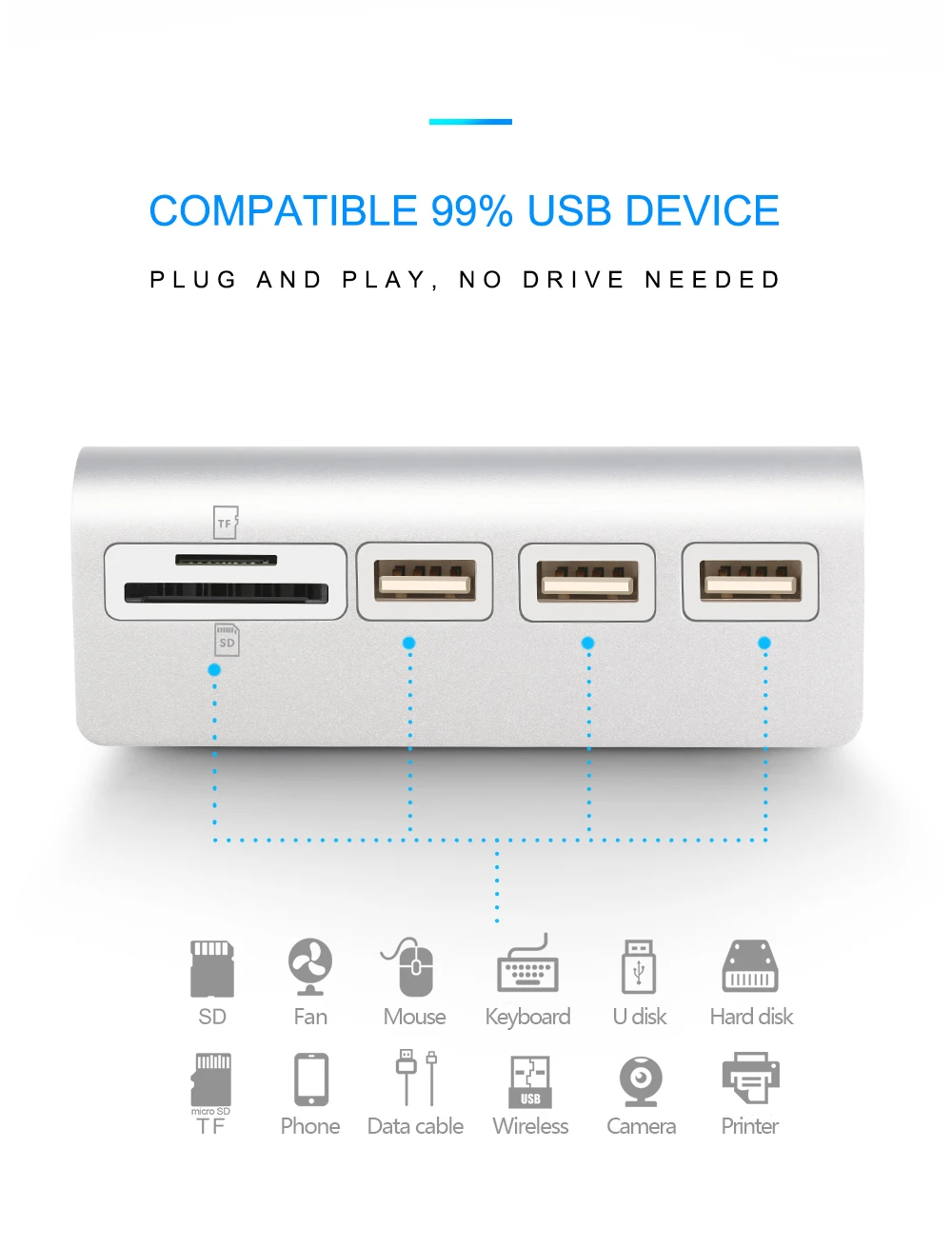 •USB 2.0 Hub with SD/TF Card Reader