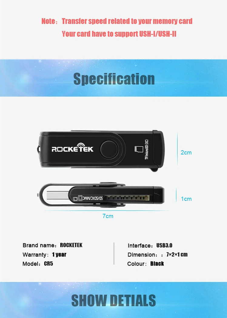 Rocketek® RT-CR5 SuperSpeed USB 3.0 SD Card Reader base on Easy portability design, with a build-in Card Cover, it is able to store a Card inside the memory card reader, and don't need to worry about losing the cards.