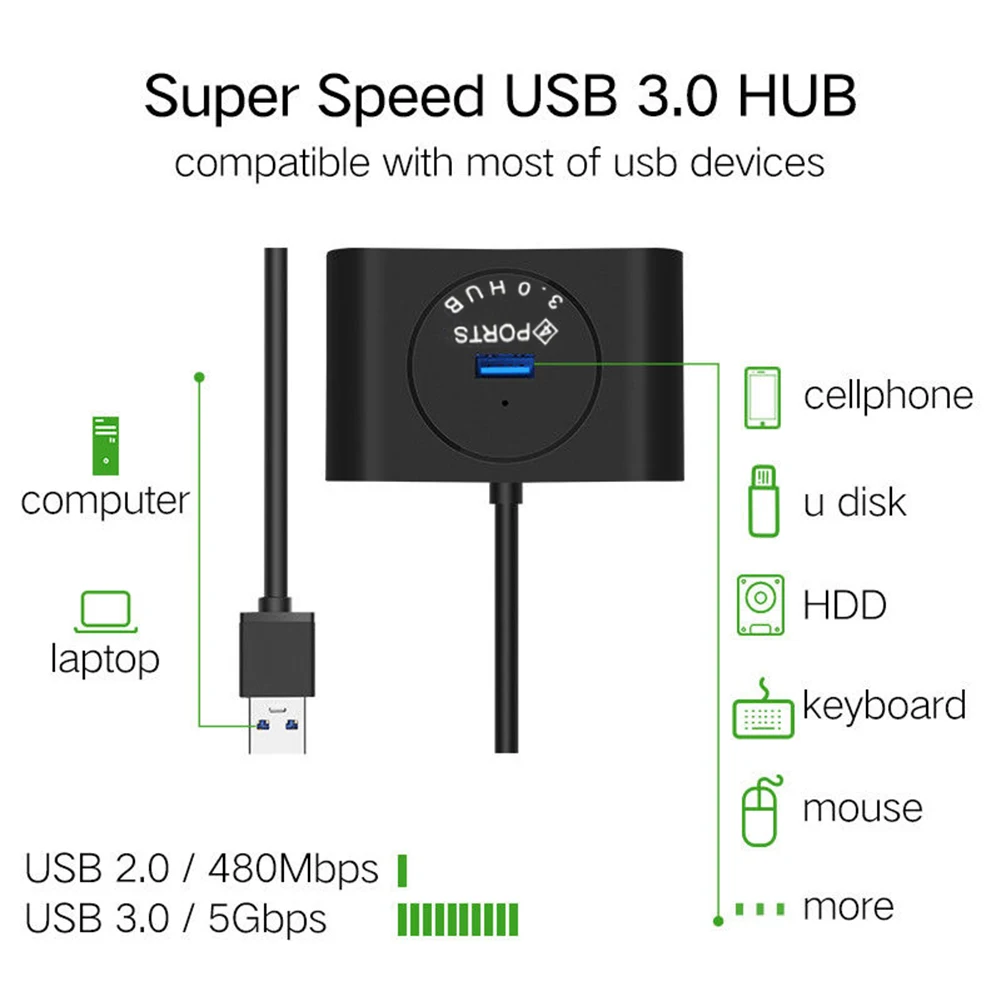 4-PORT USB 3.0 HUB simply helps you to connect up to 4 USB devices to your PC or Laptop, such as external hard drives, USB flash drives, mouse, keyboard, USB headphone, speakers, memory cards, keyboard, mouse and much more USB devices etc. It keeps you away from the trouble of plugging& unplugging repeatedly.