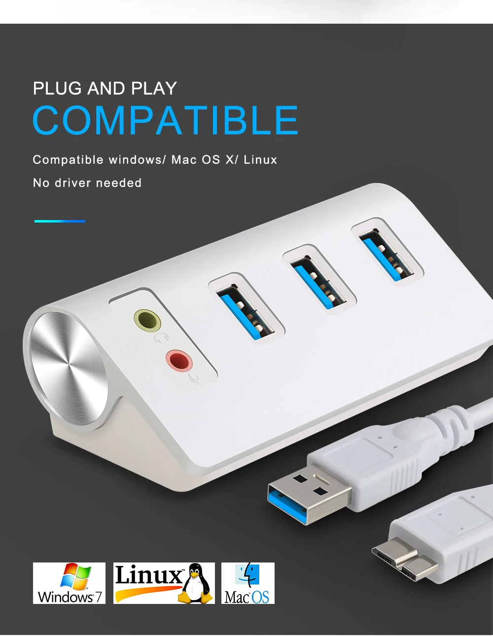 Cateck USB 3.0 3-Port Hub with Stereo Sound Adapter Combo is designed especially for laptops, tablets, and ultrabooks and expands one USB 3.0 high-speed port into three easily.